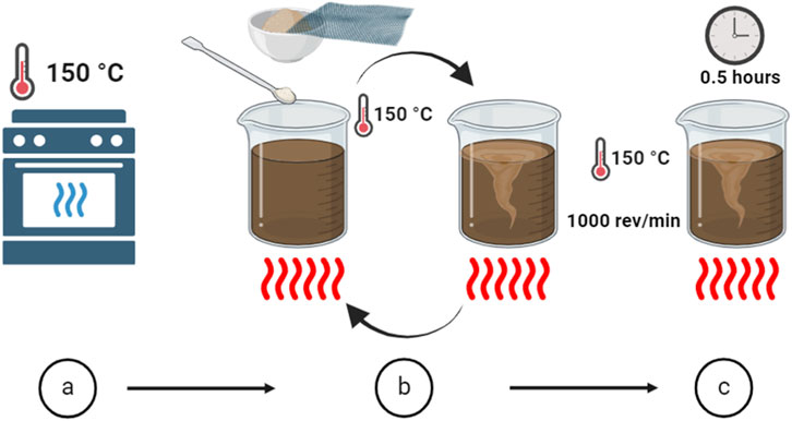 The process for preparing GO-modified asphalt involved three distinct steps Figure 2. First, 600 g of base asphalt (BA) was slowly heated to 150 °C until it was fully melted and uniform (Step a). Then, the predetermined amount of GO was gradually added to the molten asphalt. After each addition, the mixture was stirred continuously at 1000 revolutions per minute to ensure even distribution. This process was repeated until all the GO was incorporated (Step b). Finally, the asphalt-GO mixture was kept stirring at 150 °C for another 30 min to achieve thorough homogenization of the nanomaterial within the asphalt matrix (Step c).