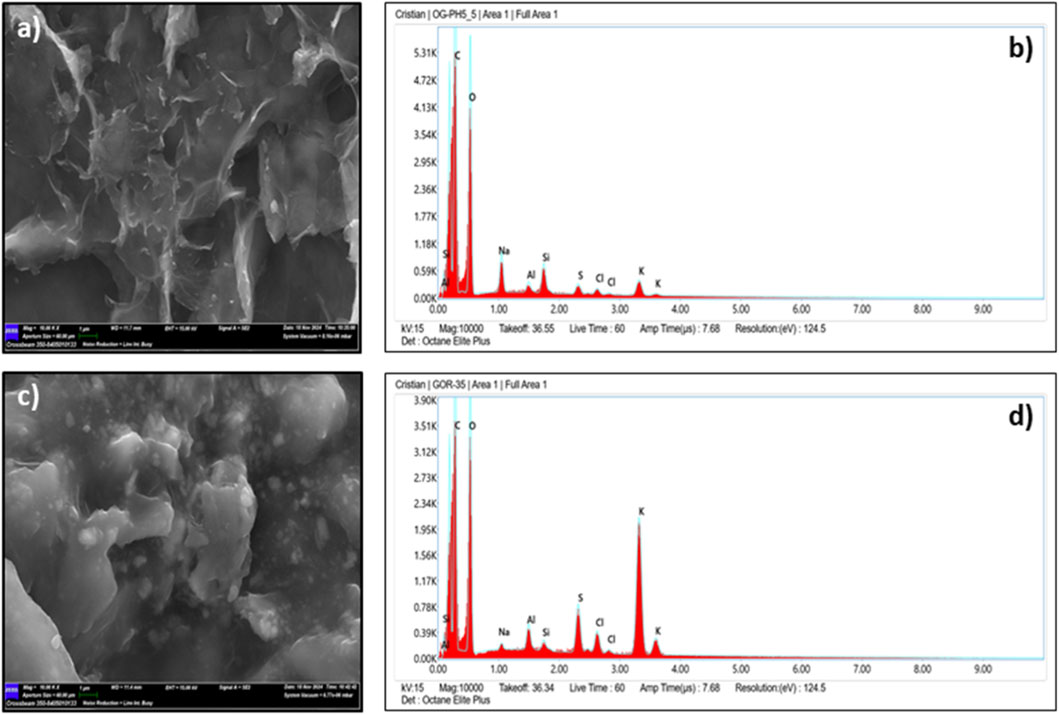 The SEM micrograph of GO (Figure 4a) showed a characteristic morphology of folded, wrinkled, and overlapping layers that are randomly arranged—features commonly linked to exfoliated GO sheets. EDS analysis (Figure 4b) confirmed that this sample mainly consists of carbon (61.9%) and oxygen (32.3%), with trace elements including sodium (1.9%), aluminum (0.4%), silicon (1.0%), sulfur (0.5%), chlorine (0.4%), and potassium (1.5%).