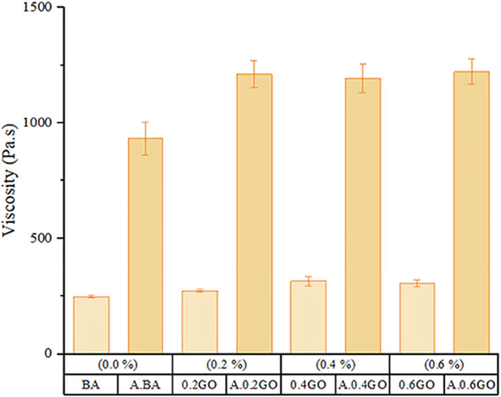 Figure 11a shows the results of the Brookfield rotational viscosity test for the asphalt samples. An apparent increase in viscosity is observed with the gradual addition of GO, reaching a peak at the 0.4GO sample. Interestingly, viscosity decreases slightly when the GO content increases from 0.4% to 0.6%, a trend that aligns with findings reported in previous studies (Jiang et al., 2022; Wu et al., 2022). Compared to the mean viscosity of the BA, adding GO at 0.2%, 0.4%, and 0.6% resulted in increases of 4.26%, 14.32%, and 13.94%, respectively. The 0.4GO sample exhibited the highest viscosity, only slightly higher than the 0.6GO sample. Variance among all samples remained consistent, thanks to the precision and repeatability of the testing equipment.