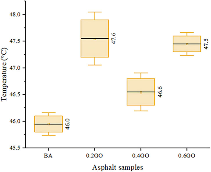 Figure 7 shows the softening point results for the asphalt samples. An irregular trend is observed, with softening point values generally increasing as GO concentration rises. This observation is consistent with previous findings in the literature (Wu et al., 2022; Zeng et al., 2017), although other studies have reported more linear trends in the increase of softening point with rising GO content (Jiang et al., 2022; Qian et al., 2022; Zeng et al., 2020; Zhang et al., 2022). When compared to the mean softening point of the BA sample, the incorporation of 0.2%, 0.4%, and 0.6% GO led to increases of 3.48%, 1.30%, and 3.26%, respectively. Interestingly, the highest softening point was recorded for the 0.2GO sample. It is important to note that this sample also exhibited considerable variance, which overlapped substantially with the results for the 0.6GO sample—an effect likely influenced by the inherent variability of the test method used.
