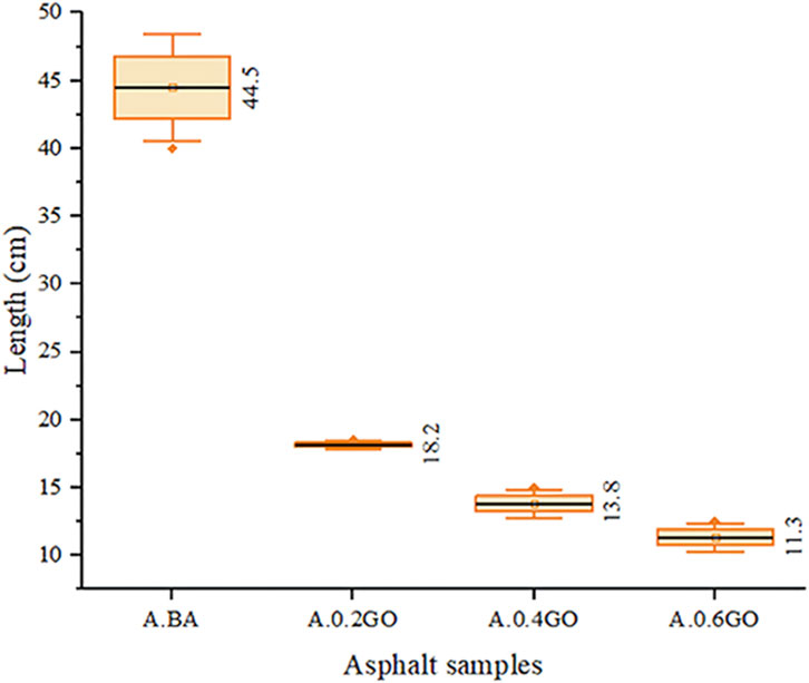 Figure 9 displays the ductility results of the aged asphalt samples. A marked and progressive reduction in ductility was observed as the GO content increased, consistent with findings reported in previous studies (Jiang et al., 2022; Zhang et al., 2022). However, this contrasts with the results of Qian et al., who documented a gradual improvement in ductility with increasing GO content (Qian et al., 2022). When compared to the mean ductility of the A.BA, the addition of 0.2%, 0.4%, and 0.6% GO resulted in reductions of 59.10%, 68.99%, and 74.60%, respectively. The lowest ductility was recorded for the A.0.6GO sample. Notably, the A.BA sample exhibited considerable variance, likely due to the sensitivity of the testing procedure, whereas the GO-modified samples demonstrated more consistent results across replicates.