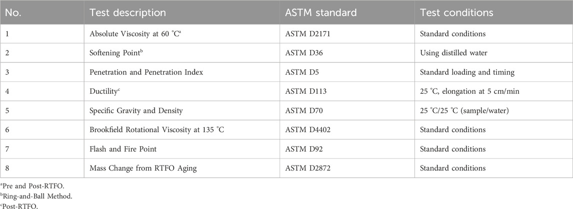 The asphalt samples were tested following recognized ASTM (American Society for Testing and Materials) standards. The tests, their corresponding ASTM designations, and the specific test conditions are summarized in Table 2.