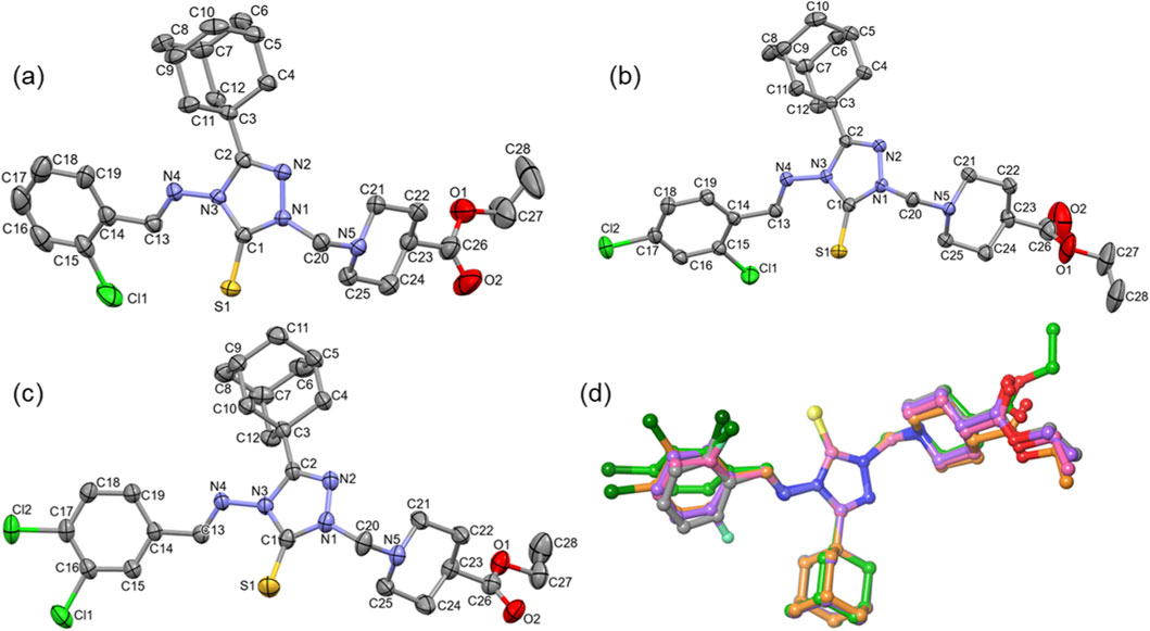 X-ray analysis reveals that compound D crystallizes in the monoclinic system (space group P21/c), while compounds B and E crystallize in the triclinic system (space group P-1). ORTEP representations of these compounds are shown in Figures 1a–c. Structural superimposition of compounds B, D and E highlights a strong alignment of the 1,2,4-triazole-3-thione core, adamantane cage and piperidine moieties (Figure 1d). However, the substituted benzylidene ring exhibits some rotational distortion, and deviations are also observed in the orientation of the ethoxycarbonyl group. Interestingly, compounds B and E share a similar ethoxycarbonyl orientation, whereas compound D adopts a distinct conformation. In all five compounds, the fused-ring systems of the adamantyl moiety and piperidine ring adopt a chair conformation.