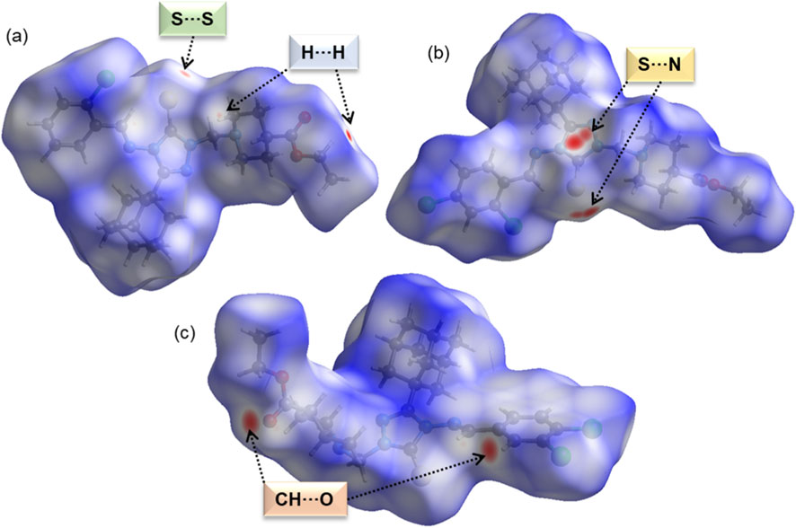 Hirshfeld surface analysis reveals key short contacts that likely contribute to the stability of each crystal structure (Figures 2a–c). In compound B, a small red spot marks a short S···S contact, indicating a chalcogen bond. Additionally, short H···H contacts appear as small red spots, particularly around the surface of the piperidine ring and terminal methyl group. In compound D, double red spots near thione group and over the triazole ring surface suggest S···N/π chalcogen bonding. For compound E, red spots highlight intermolecular C–H···O interactions. These findings indicate that such contacts play a crucial role in stabilizing the crystal structures.
