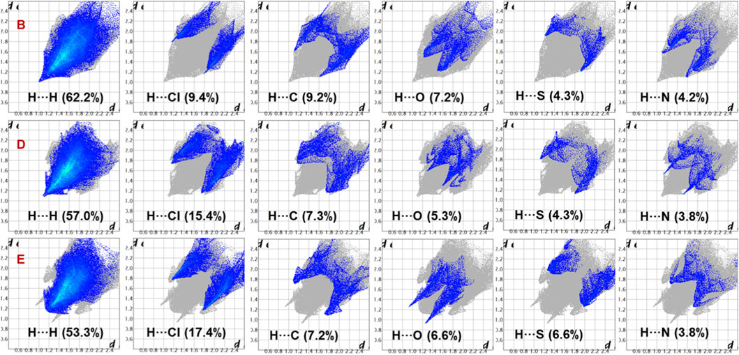 Figure 3. Decomposed 2D fingerprint plots showing the relative contributions of various intermolecular interactions in the crystal structures of compounds B, D, and E.
