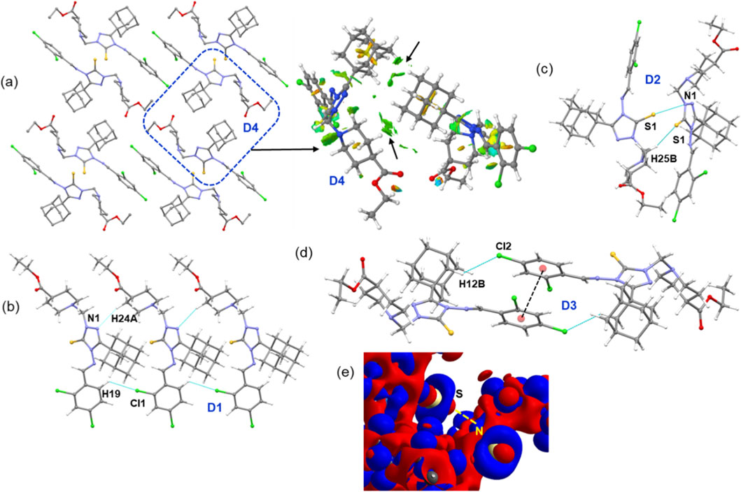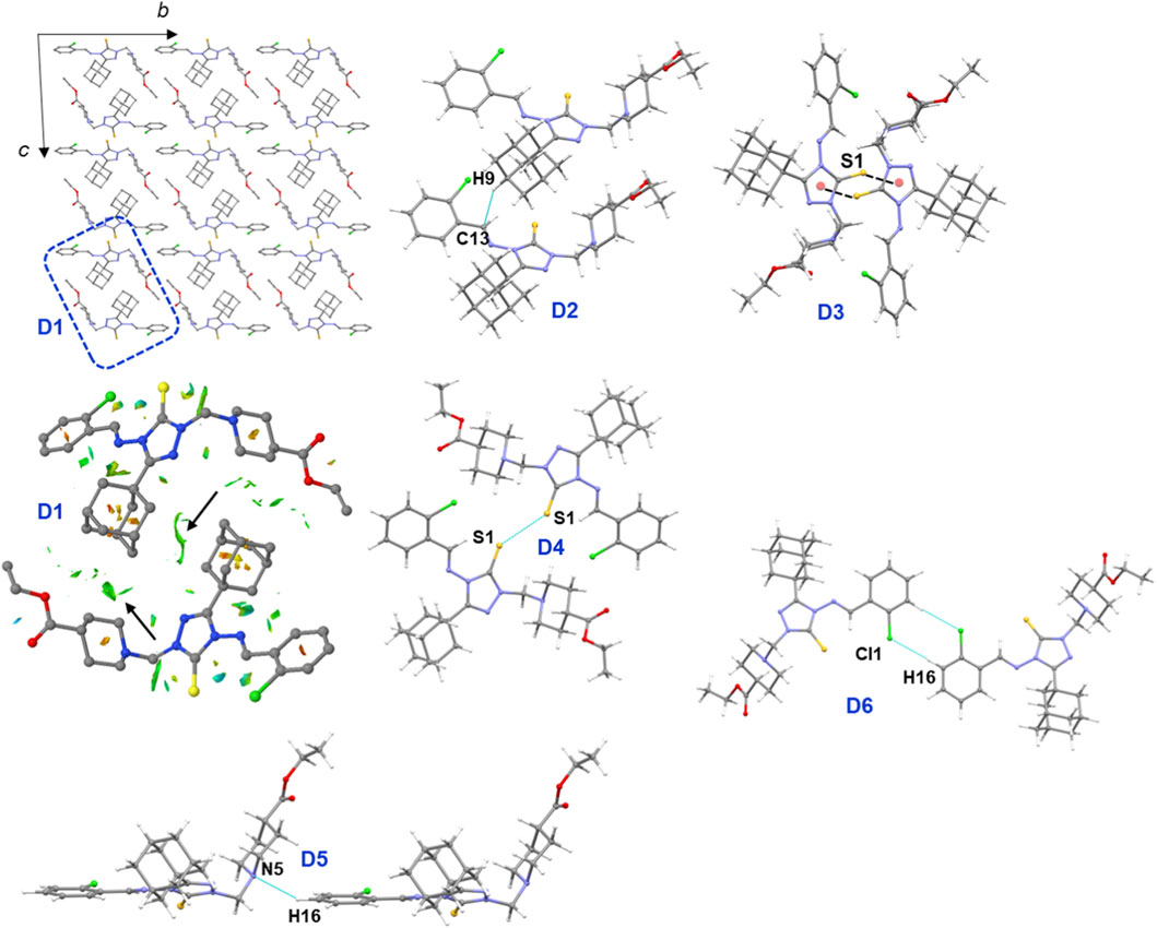 The next most stable dimer, D3 (ΔEtotal = −12.68 kcal mol−1), is supported by a combination of a C–H···Cl interaction and π-stacking between adjacent dichloro phenyl rings, with a separation of 3.731 (2) Å. As expected, dispersion energy contributes 73% to its stabilization. A similar dimer is found in compound D, but the participating chlorine atom differs: in compound D, the ortho chlorine atom is involved, while in compound E, it is the meta chlorine atom. The D3 dimer in compound E is slightly stronger than its counterpart in compound D. Another recuring dimer, D4 (ΔEtotal = −7.20 kcal mol−1), is formed by short Csp3–H···H–Csp3 contacts between neighbouring adamantane groups. The NCI plot confirms the weak nature of these interactions, and energy decomposition analysis shows that dispersion energy contributes 83% to its stabilization. While the interaction energy of dimer D4 is nearly equal to its counterpart in compound D, the corresponding dimer in compound B, which is formed by similar Csp3–H···H–Csp3 contacts, exhibits even greater stability. The remaining two molecular dimers, D5 (ΔEtotal = −2.98 kcal mol−1) and D6 (ΔEtotal = −1.69 kcal mol−1), are stabilized by intermolecular C–H···Cl interactions. These interactions link the molecules into a chain in the solid state. Dispersion energy contributes 82% and 78%, to the stabilization of dimers D5 and D6, respectively.