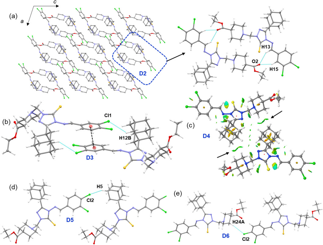 Dimer D5 is stabilized by an intermolecular C–H···N interaction involving the piperidine N and the substituted phenyl ring, with a ΔEtotal value of −3.83 kcal mol−1. Dispersion energy contributes 73% to its stabilization. The sixth dimer, D6, is stabilized by an intermolecular C–H···Cl interaction (ΔEtotal = −2.14 kcal mol−1). This interaction occurs between molecules related by a center of inversion symmetry and gives rise to an