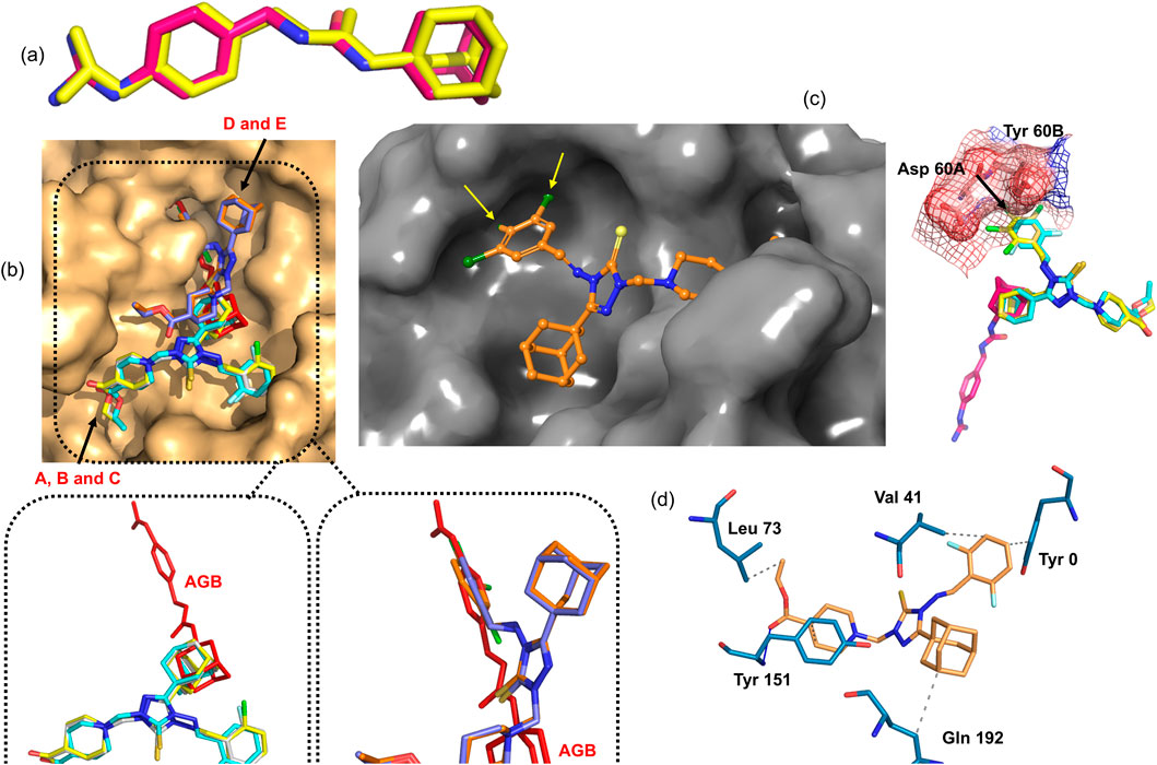 Figure 8. (a) Experimental (pink) and predicted (yellow) conformations of the control inhibitor (AGB), (b) surface representation of uPA showing the active-site cavity with the predicted conformations of compounds A-E; the dotted box highlights the similar orientations of compounds A-C and D-E along with the control inhibitor, (c) model of chlorine substitution at the 2,4,5 positions using the most potent compound C, showing steric hindrance with residues Asp 60A and Tyr 60B residues; surface and mesh representations further illustrate this steric hindrance, (d) uPA-compound C interactions.