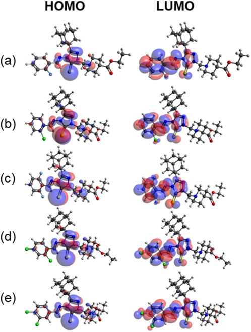 Figure 9. Highest occupied molecular orbitals (left panel) and lowest unoccupied molecular orbitals (right panel) for compounds (a–e).