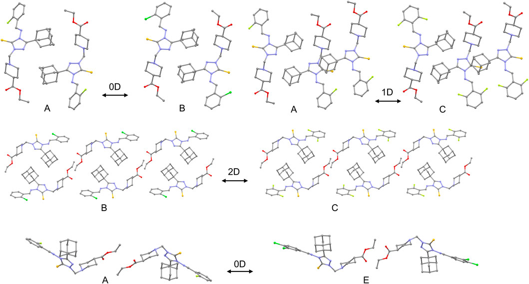 All gas-phase geometry optimization were performed with the Gaussian 09 program (Frisch et al., 2013) at the M06-2X/def2-TZVP level of theory (Weigend and Ahlrichs, 2005; Zhao and Truhlar, 2008), including Grimme’s D3 empirical dispersion correction (Grimme et al., 2010; Grimme et al., 2011). Vibrational frequency calculations at the same level confirmed all optimized structures as true energy minima. For the molecular dimers identified in the crystal structures of compounds B, D, and E, the C–H bond distances were first normalized to typical neutron diffraction values (1.083 Å) (Groom et al., 2016). The interaction energies of these dimers were then analyzed using generalized Kohn-Sham energy decomposition analysis (GKS-EDA) in the XEDA program (Su et al., 2020; Tang et al., 2021) at the