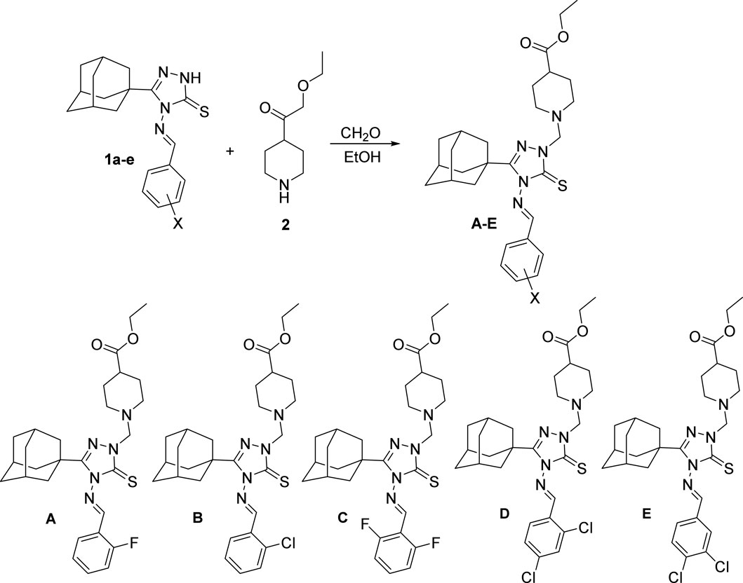 Scheme 1. The synthetic pathway and structures of the investigated compounds (A–E). Ethyl 1-{[3-(adamantan-1-yl)-4-{[(2-fluorophenyl)methylidene]amino}-5-sulfanylidene-4,5-dihydro-1H-1,2,4-triazol-1-yl]methyl}piperidine-4-carboxylate (A) Mol. Formula (Mol. Weight): C28H36FN5O2S (525.69). Yield: 72%. Melting point: 134 °C–136 °C (uncorrected). Ethyl 1-{[3-(adamantan-1-yl)-4-{[(2-chlorophenyl)methylidene]amino}-5-sulfanylidene-4,5-dihydro-1H-1,2,4-triazol-1-yl]methyl}piperidine-4-carboxylate (B) Mol. Formula (Mol. Weight): C28H36ClN5O2S (542.14). Yield: 75%. Melting point: 158 °C–160 °C (uncorrected). Ethyl 1-{[3-(adamantan-1-yl)-4-{[(2,6-difluorophenyl)methylidene]amino}-5-sulfanylidene-4,5-dihydro-1H-1,2,4-triazol-1-yl]methyl}piperidine-4-carboxylate (C) Mol. Formula (Mol. Weight): C28H35F2N5O2S (543.68). Yield: 69%. Melting point: 148 °C–150 °C (uncorrected). Ethyl 1-{[3-(adamantan-1-yl)-4-{[(2,4-dichlorophenyl)methylidene]amino}-5-sulfanylidene-4,5-dihydro-1H-1,2,4-triazol-1-yl]methyl}piperidine-4-carboxylate (D) Mol. Formula (Mol. Weight): C28H35Cl2N5O2S (576.58). Yield: 68%. Melting point: 129 °C–131 °C (uncorrected). Ethyl 1-{[3-(adamantan-1-yl)-4-{[(3,4-dichlorophenyl)methylidene]amino}-5-sulfanylidene-4,5-dihydro-1H-1,2,4-triazol-1-yl]methyl}piperidine-4-carboxylate (E) Mol. Formula (Mol. Weight): C28H35Cl2N5O2S (576.58). Yield: 71%. Melting point: 186 °C–188 °C (uncorrected).