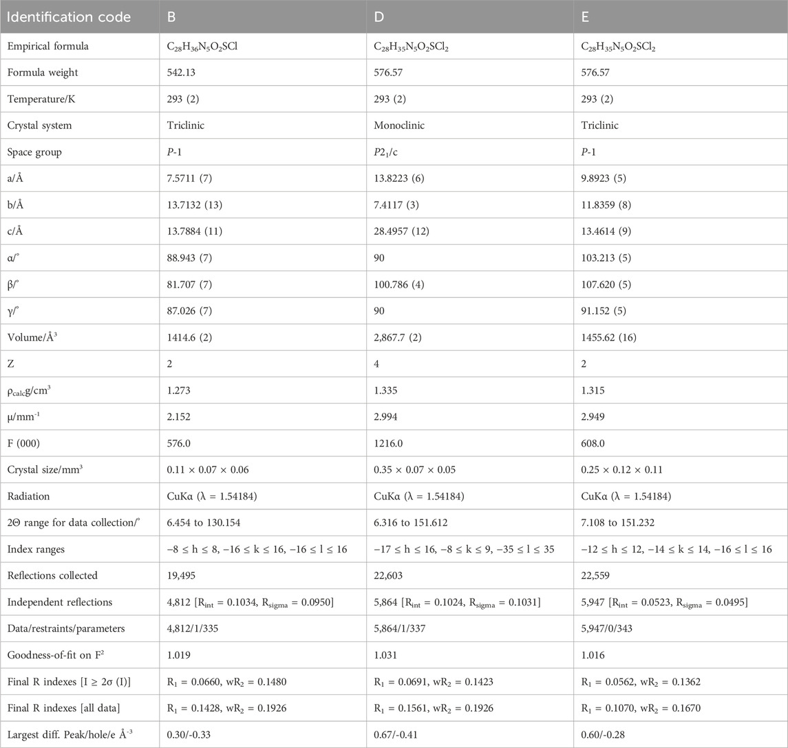 The compounds differ in the type of halogen substitution (fluorine or chlorine) in the benzylidene ring. Two are monosubstituted, while the remaining three feature di-substitutions. All five compounds were successfully crystallized for X-ray analysis, although the quality of the X-ray data varied. The chloro-substituted compounds provided high-quality data suitable for detailed structural analysis, whereas the fluoro-substituted derivatives yielded lower-quality data. Multiple attempts to obtain high-quality crystals and X-ray data for the fluoro derivatives were unsuccessful. Crystal data and structure refinement parameters for compounds B, D, and E are summarized in Table 1, while the corresponding details for the fluoro-substituted compounds are provided in Supplementary Table S1. The unit-cell dimensions of compounds A, B, and C are comparable, and they exhibit similar packing features in the solid state (Supplementary Figure S1).