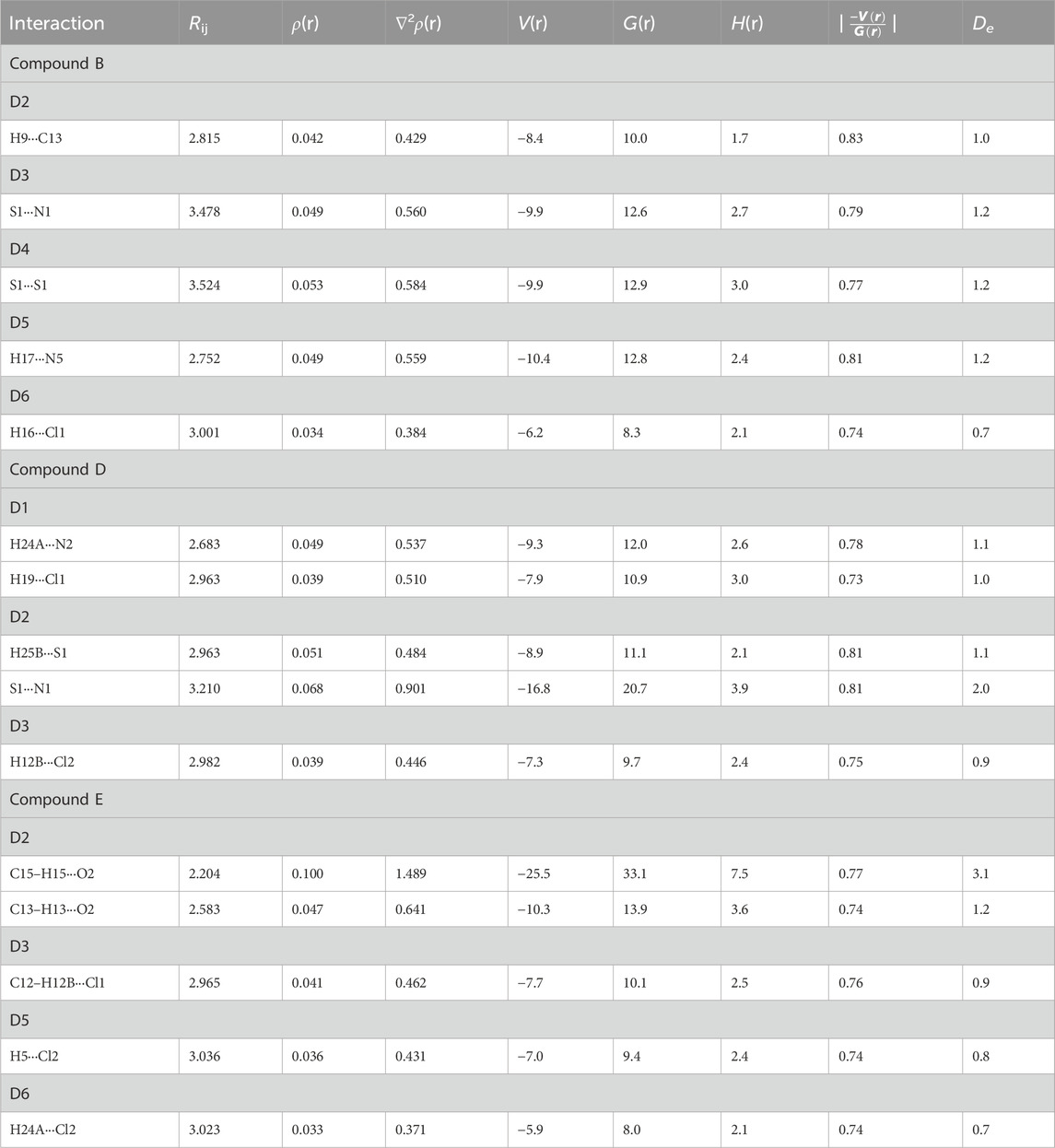 The nature and strength of the intermolecular interactions governing the crystal packing of compounds B, D, and E were investigated using the QTAIM framework (Bader, 1991). The topological properties of the electron density, ρ(r), were analyzed at the bond critical points (BCPs) located between interacting atoms. Key topological parameters for all identified interactions in selected molecular dimers are summarized in Table 5, and the corresponding molecular graphs are illustrated in the Supplementary Material (Supplementary Figures S4-S6).