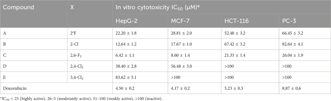The results indicate that the cytotoxicity of compounds A-E mainly depends on the nature and position of the halogen substituents (X) in the haloaryl moiety. The 2-fluorophenyl analogue A showed good activity against HePG-2, moderate activity against MCF-7, and weak activity against HCT-116 and PC-3 cell lines. Replacement of the fluorine atom in compound A with chlorine (compound B) enhanced the activity against HePG-2 and MCF-7 and altered the activity against HCT-116 and PC-3. The highest activity was observed for the 2,6-difluorophenyl analogue C, which exhibited potent activity against HePG-2, MCF-7, and HCT-116, and moderate activity against PC-3. In contrast, the 2,4-dichlorophenyl analogue D showed inferior activity compared to its 2-chlorophenyl analogue B, it retained only weak activity against HePG-2 and MCF-7 and lacked activity against HCT-116 and PC-3. Furthermore, replacing the 2,4-dichlorophenyl moiety in compound D with a 3,4-dichlorophenyl group (compound E) markedly reduced the activity; compound E retained only marginal activity against HePG-2 and showed no activity against MCF-7, HCT-116 and PC-3 cell lines.