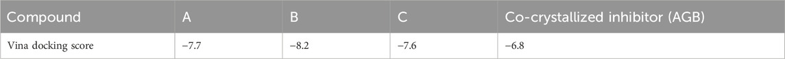 Table 7. Vina docking scores for the title compounds A-C and the co-crystallized inhibitor in kcal mol-1.