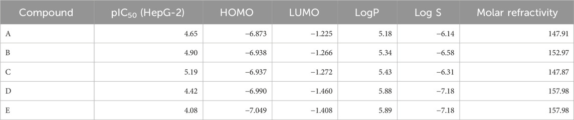 Recent review articles have shown that different studies use various molecular descriptors to predict the biological activity of small molecules (Huang et al., 2021; Vasilev and Atanasova, 2025). In this work, the relationship between the observed antiproliferative activity and key chemical properties of compounds A-E was examined by correlating their IC50 values (against the HepG-2 cell line) with selected physicochemical and electronic descriptors (Table 8). The descriptors included ADME (absorption, distribution, metabolism and excretion) parameters obtained from the SwissADME server (Daina et al., 2017) and quantum chemical indices such as HOMO and LUMO energies. Compounds showing IC50 values greater than 100 μM against other cell lines were considered weakly active and were excluded from the correlation analysis.