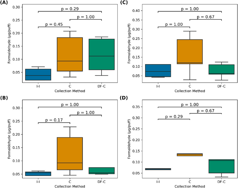 Figure 2. Formaldehyde emissions (µg/puff) per collection method for (A) a mod at 1 LPM and (B) 1.5 LPM and (C) a pod and 1 LPM and (D) 1.5 LPM.