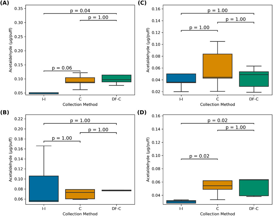 Figure 3. Acetaldehyde emissions (µg/puff) per collection method for (A) a mod at 1 LPM and (B) 1.5 LPM and (C) a pod and 1 LPM and (D) 1.5 LPM.