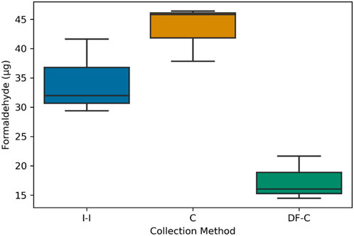 The collection methods were first evaluated using an artificially generated gas-phase formaldehyde that was introduced into a Tedlar bag to achieve a known formaldehyde concentration. The results showed that the C method collected the highest formaldehyde mass (43 ± 5 µg), followed by the I-I method (34 ± 6 µg), and the lowest being the DF-C method (17 ± 4 µg) (Figure 4). The mass of formaldehyde collected with the C method was 29.5% less than expected (61 ± 6 µg). This discrepancy could be attributed to formaldehyde being lost to the walls and tubing of the Tedlar bag.