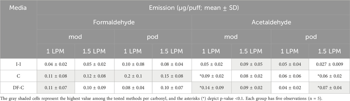 Table 1. Carbonyl emissions (µg/puff) for mod and pod devices at 1.0 LPM and 1.5 LPM for all media combinations.