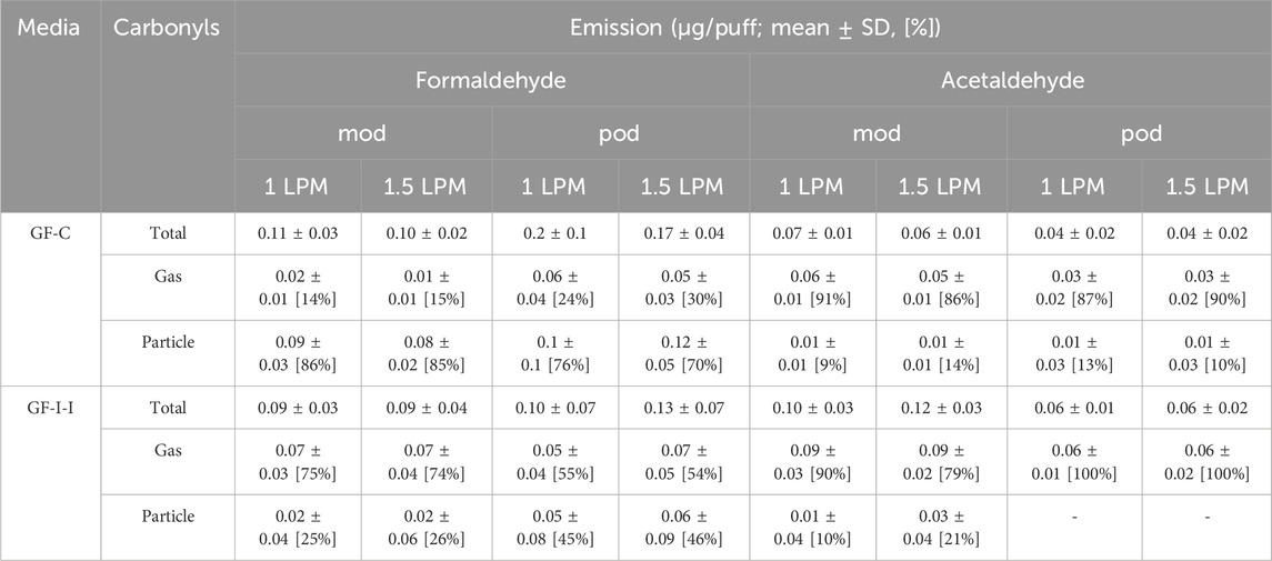 Table 2. Carbonyl emissions (µg/puff) for mod and pod devices at 1.0 LPM and 1.5 LPM using the GF-C and GF-I-I methods. Each group has five observations (n = 5).