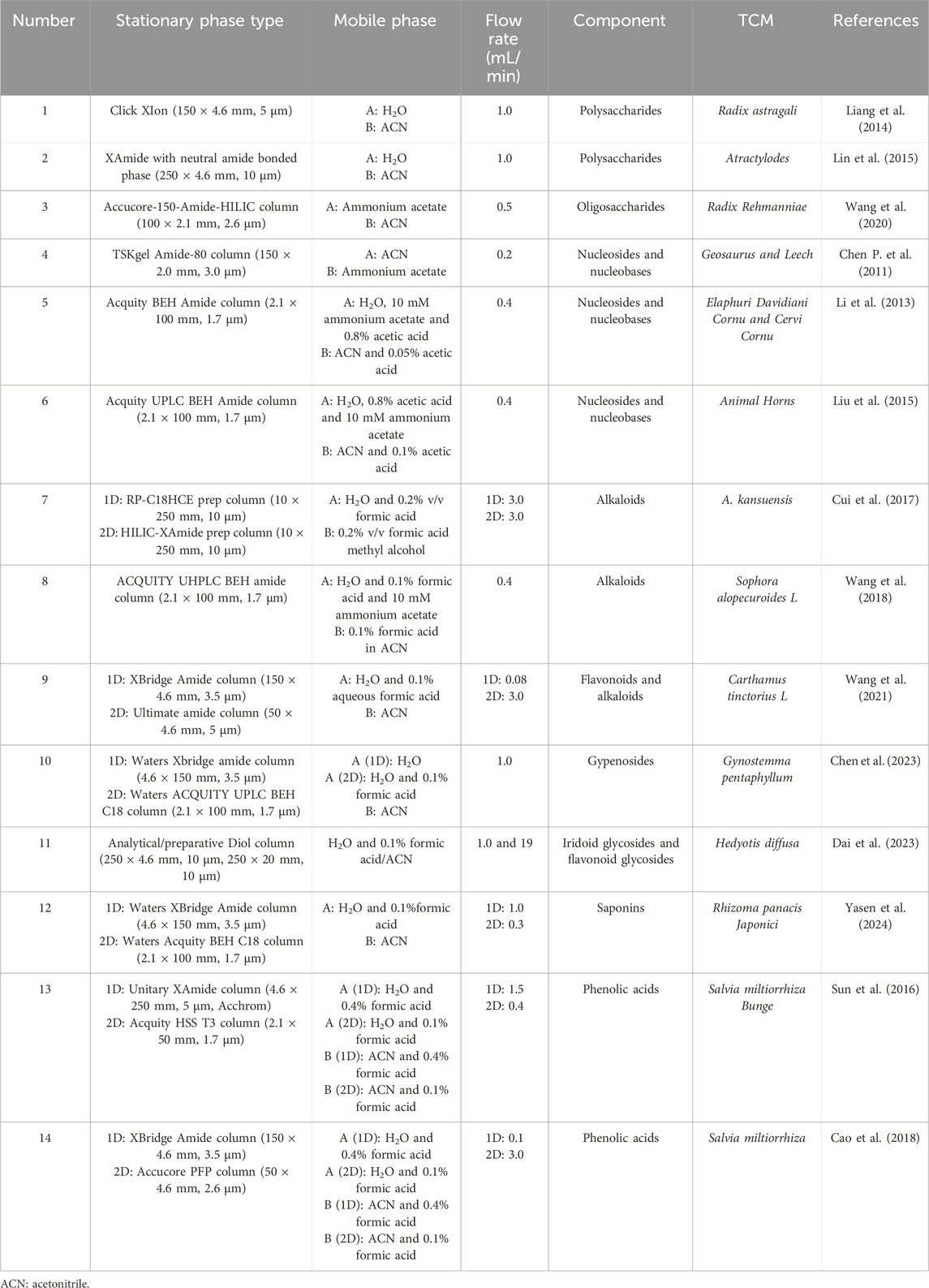 There are many types of active ingredients in TCM, which can be classified based on their chemical structures, such as polysaccharides, glycosides, alkaloids, organic acids, volatile oils, and terpenes. Among them, polar compounds, such as phenolic acids, alkaloids, and saponins often face technical bottlenecks, including weak retention and insufficient resolution in RPLC. In contrast, HILIC effectively enhances their chromatographic retention behavior through a unique hydrophilic mechanism, significantly improving separation efficiency (Liu et al., 2019). The applications of HILIC in TCM analysis are comprehensively summarized in Table 1.