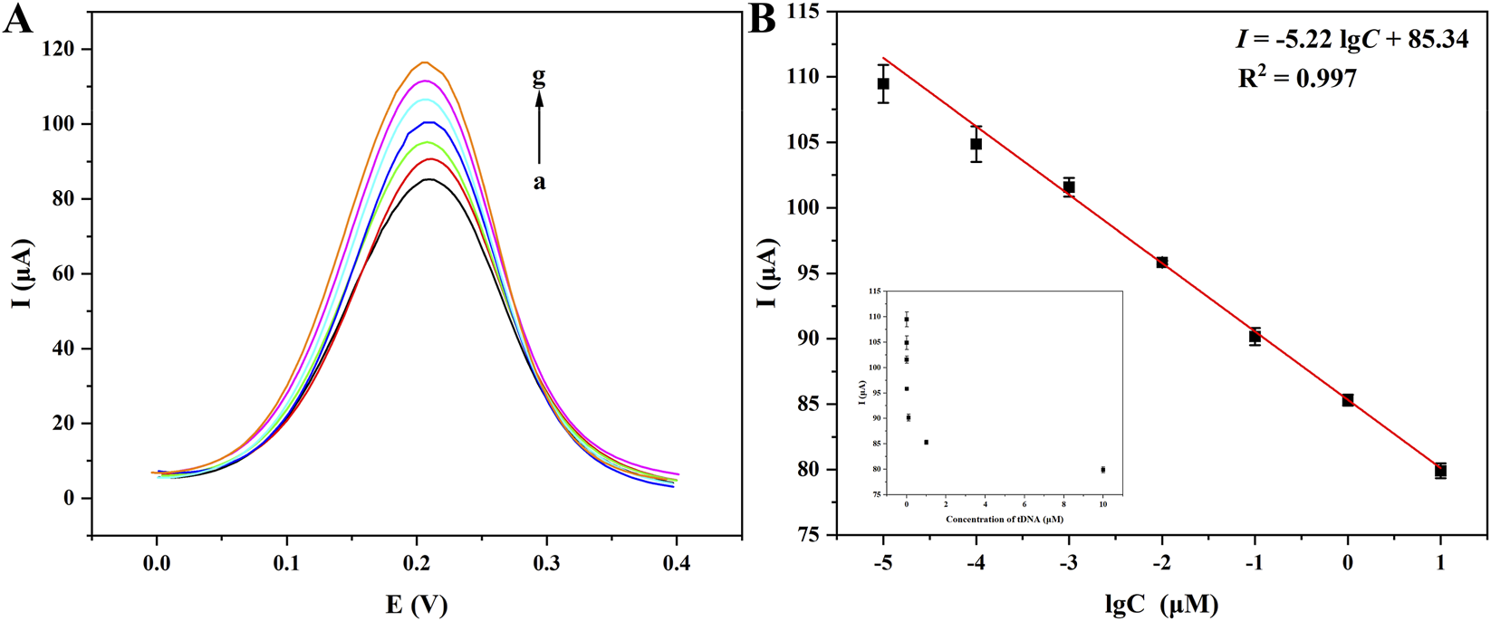 Figure 5. DPV curves of CYFRA 21-1 at different concentrations detected by the biosensor of Fe3O4/α-Fe2O3@Au-DNA/BSA as probe (A): (a–g): 10 μM, 1 μM, 100 nM, 10 nM, 1 nM, 100 pM, 10 pM; linear relationship between different concentrations of CYFRA 21-1 DNA and currents (B).