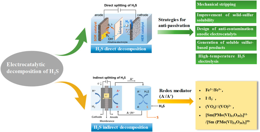 Electrochemical decomposition of H2S demonstrates superior advantages over alternative technologies, featuring mild reaction conditions (room temperature and atmospheric pressure), low energy requirements, high efficiency, simple operation, and spatially separable hydrogen/sulfur products, representing a promising route for clean and value-added H2S utilization (Yang et al., 2023; Zhou et al., 2018). By constructing a multi-stage electrolysis system, this technology not only enables effective removal of H2S within a wide concentration range, but also produces green hydrogen and elemental sulfur simultaneously, displaying a one-stone-kills-two-birds strategy for environmentally friendly and economic benefits (Pei et al., 2021). Electrocatalytic splitting of H2S technology comprises two approaches, namely, direct and indirect H2S decomposition. The direct electrocatalytic decomposition of H2S occurs at the anode electrode, with a theoretical decomposition voltage (∼0.17 V vs. SHE) that is significantly lower than that of water electrolysis (1.23 V) (Kim and Lee, 2023; Zhang et al., 2022). Nevertheless, it faces challenges, including low activity of catalytic materials and sulfur passivation in the sulfur oxidation reaction on electrodes (Yi et al., 2021). In contrast, the indirect decomposition of H2S employs redox couples as mediators. In this process, sulfur ions are oxidized by redox mediator to elemental sulfur (Zhou et al., 2018). This approach circumvents anode sulfur passivation but encounters issues such as elevated cell voltage and mismatched reaction rates between sulfur oxidation and electrochemical processes; thus, the selection of redox mediators is essential.