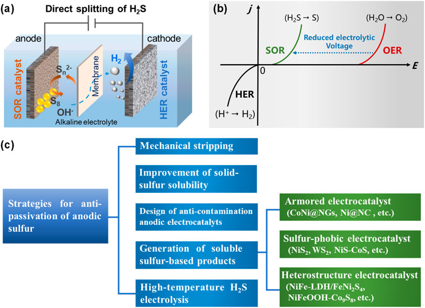 Figure 2. (a) Schematic illustration of directly H2S electrolysis, (b) the electrochemical potentials of SOR for H2S splitting over OER for typical water splitting, and (c) strategies for anti-passivation of anodic sulfur (Garg et al., 2023; Yu et al., 2024).