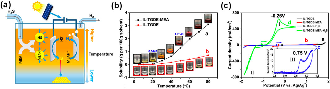 Organic solvents such as ionic liquids used as electrolytes have been demonstrated to have significant potential in enhancing sulfur solubility while maintaining favorable electrical conductivity (Li et al., 2024; Ma et al., 2017; Wang et al., 2019; Yang et al., 2025). Ma et al. constructed an organic electrolyte system for the direct electrolysis of H2S using ionic liquid [C3OHmim]BF4 as the electrolyte, tetraethylene glycol dimethyl ether (TGDE) as the solvent, and monoethanolamine (MEA) as the absorbent for H2S (Figure 3a). The research finds that the prepared organic electrolyte system is highly temperature-dependent on the sulfur solubility electrolyte and has the catalytic effect of the absorbent MEA. As shown in Figure 3b, due to the solubility of sulfur in organic solutions varying greatly with temperature, the high temperature zone near the anode can maximize the dissolution of precipitated sulfur in the reaction process, and the subsequent low temperature zone away from the electrode makes the sulfur precipitation, thus recovering sulfur. Meanwhile, the reaction of MEA with H2S would produce protonated MEA (MEAH+) and HS− (MEA + H2S → MEAH+ + HS−), which not only increases the solubility of H2S in the electrolyte system, but also makes it easier for H2S to be electrolyzed into HS− and promotes the oxidation of HS−. As a result, the addition of MEA led to a decrease in the oxidation potential of H2S from 0.75 V to −0.26 V, improving the electrolysis efficiency (Figure 3c). Highly efficient and continuous electrolysis of H2S can be achieved in this organic electrolyte system with Faraday efficiency of H2 up to 89%.