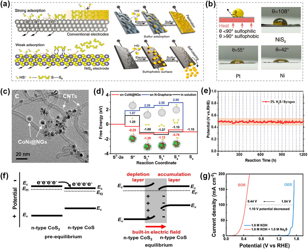 Figure 4. Design of anti-contamination anodic electrocatalyst. (a) Strong interaction between electrodes and sulfides leads to sulfur passivation during long-term operation, whereas weak interactions repel sulfur and realize self-cleaning electrolysis, and (b) the contact angle measurements of sulfur droplets (120 °C) on NiS2, Pt and Ni (Zhang B. et al., 2021). (c) HRTEM images of CoNi@NGs armored catalyst, (d) the free energy profiles of the formation of polysulfides (Sx*) in the aqueous solution on N-Graphene’s surface and CoNi@NGs’ surface, and (e) durability measurement of CoNi@NGs for removing H2S in industrial syngas via flowing with 2% H2S/syngas (Zhang et al., 2020). (f) Schematic diagrams of the energy band structures of the over-equilibrium and equilibrium states of the CoS2/CoS n-n heterojunction, and (g) the LSV curves of NiFe-LDH/FeNi2S4/IF (Ma W. et al., 2019).
