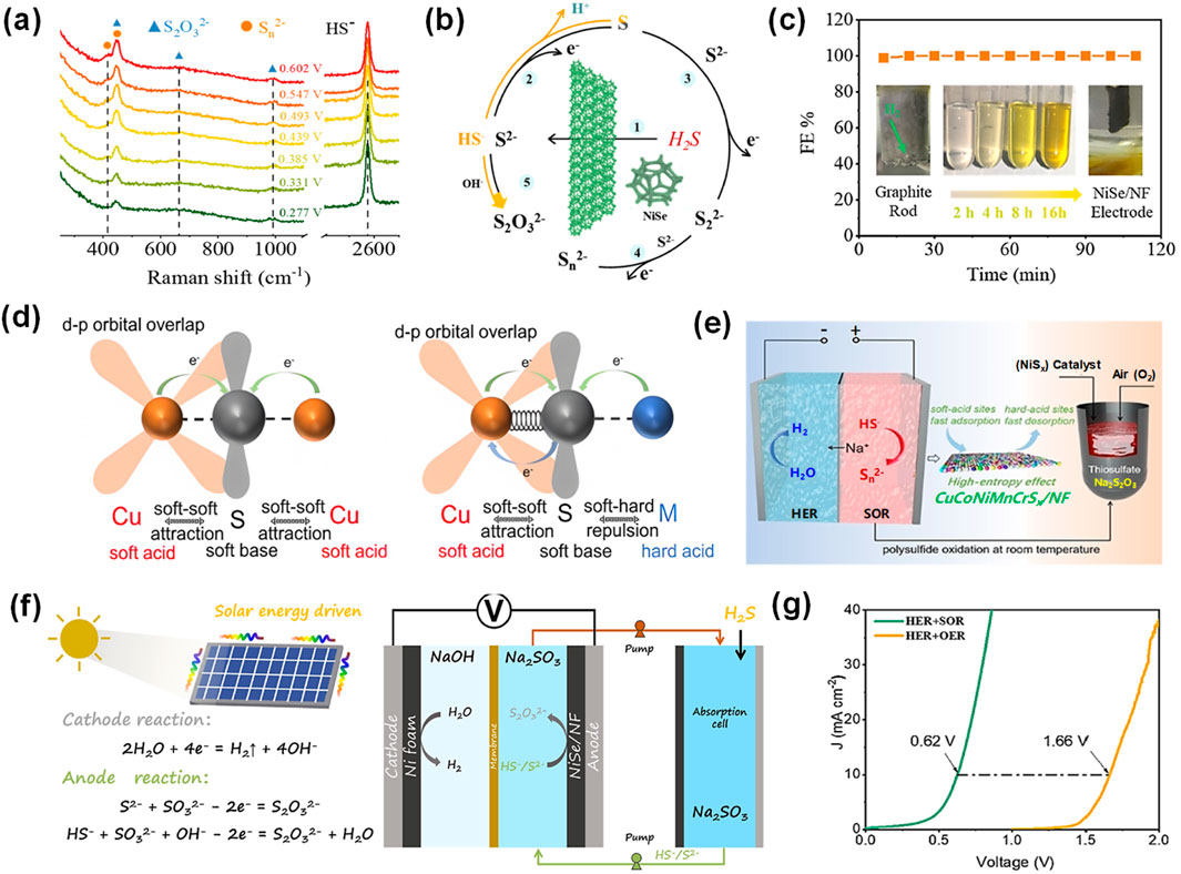 Figure 5. Strategies for the generation of soluble sulfur-based products. (a) In situ Raman spectra in the range of 250–2800 cm-1 at a potential between 0.277 and 0.602 V on NiSe/NF electrode in 1.0 M Na2S and NaOH solution, (b) The schematic diagram of the SOR reaction pathway on NiSe/NF, (c) Hydrogen faradaic efficiencies in galvanostatic test at 100 mA cm-2 (Duan et al., 2023). (d) Schematic illustration of the Cu-S bonds with/without doping of the hard-acid cations (denoted as M), (e) Schematic illustration of direct H2S decomposition for yielding Na2S2O3 products (Pei et al., 2024). (f) Direct solar-driven electrochemical decomposition of H2S to hydrogen and high-value sulfur product, (g) LSV curves of the hybrid HER and SOR of NiSe/NF (Duan et al., 2024).