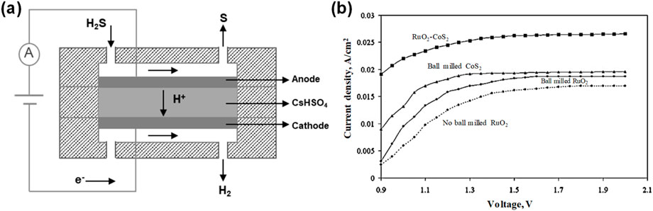 Except for aqueous electrolytes, high-temperature solid electrolyte cells for the decomposition of H2S have also been initially developed. H2S-containing gas is oxidized at the anode of a high-temperature solid molten electrolyte cell to obtain sulfur and protons, in which sulfur is discharged in the form of sulfur vapor from the anode chamber at high temperature, and then cooled and concentrated to collect sulfur at the outlet, thus preventing sulfur from being enriched at the anode electrode and prompting continuous anodic reaction (Ipsakis et al., 2015). Meanwhile, protons go through the solid electrolyte membrane to reach the cathode chamber, being reduced to hydrogen. The reported proton-conducting solid electrolytes include LiSO4, CsHSO4, (ZrO2)0.92(Y2O3)0.08, Y-CeO3, BaCeO3, etc. (Yates and Winnick, 1999; Chuang, et al., 2000; M. Liu et al., 2001; Sezer et al., 2020). Mbah et al. synthesized a RuO2-CoS2 nanocomposite as an efficient anode catalyst for electrochemical H2S decomposition (Mbah et al., 2010). They assembled an H2S decomposition cell employing CsHSO4 as a high-temperature molten solid-state electrolyte (Figure 6a). Remarkably, under optimized conditions of 150 °C and 1.35 bar where sulfur viscosity was minimized, the system could achieve the electrolytic splitting of H2S (100% content) (Figure 6b). The high-temperature solid electrolyte cells could exhibit exceptional H2S decomposition efficiency, due to the high ionic conductivity of the molten electrolyte, accelerating the electrochemical reaction kinetics. Furthermore, this approach facilitates the efficient separation of the obtained hydrogen and elemental sulfur, with sulfur being recoverable in gaseous or liquid form, thus preventing electrode blockage caused by solid sulfur deposition.