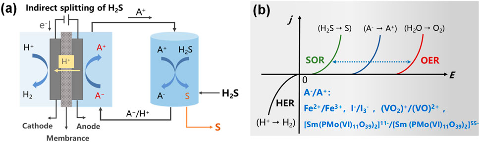 Figure 7. (a) Schematic illustration of indirect H2S electrolysis (Zhou et al., 2018) and (b) the electrochemical potentials of redox mediators for H2S splitting (Kim and Lee, 2023).