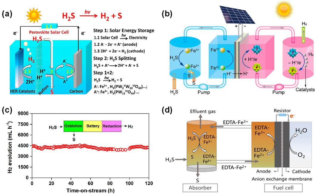 Figure 8. Fe2+/Fe3+ as redox mediators for indirect electrocatalytic decomposition of H2S. (a) Operating principle of the perovskite PV-EC H2S splitting system (Ma et al., 2016). (b) Schematic illustration of the solar redox flow batteries design for indirectly driving H2S splitting (Ma W. et al., 2019). (c) Stability test for H2S splitting into hydrogen and sulfur with the off-field electrocatalysis system (Wang S. et al., 2024). (d) A schematic representation of the proposed liquid redox sulfur recovery process with EDTA ligands and fuel cell (Kim et al., 2013).