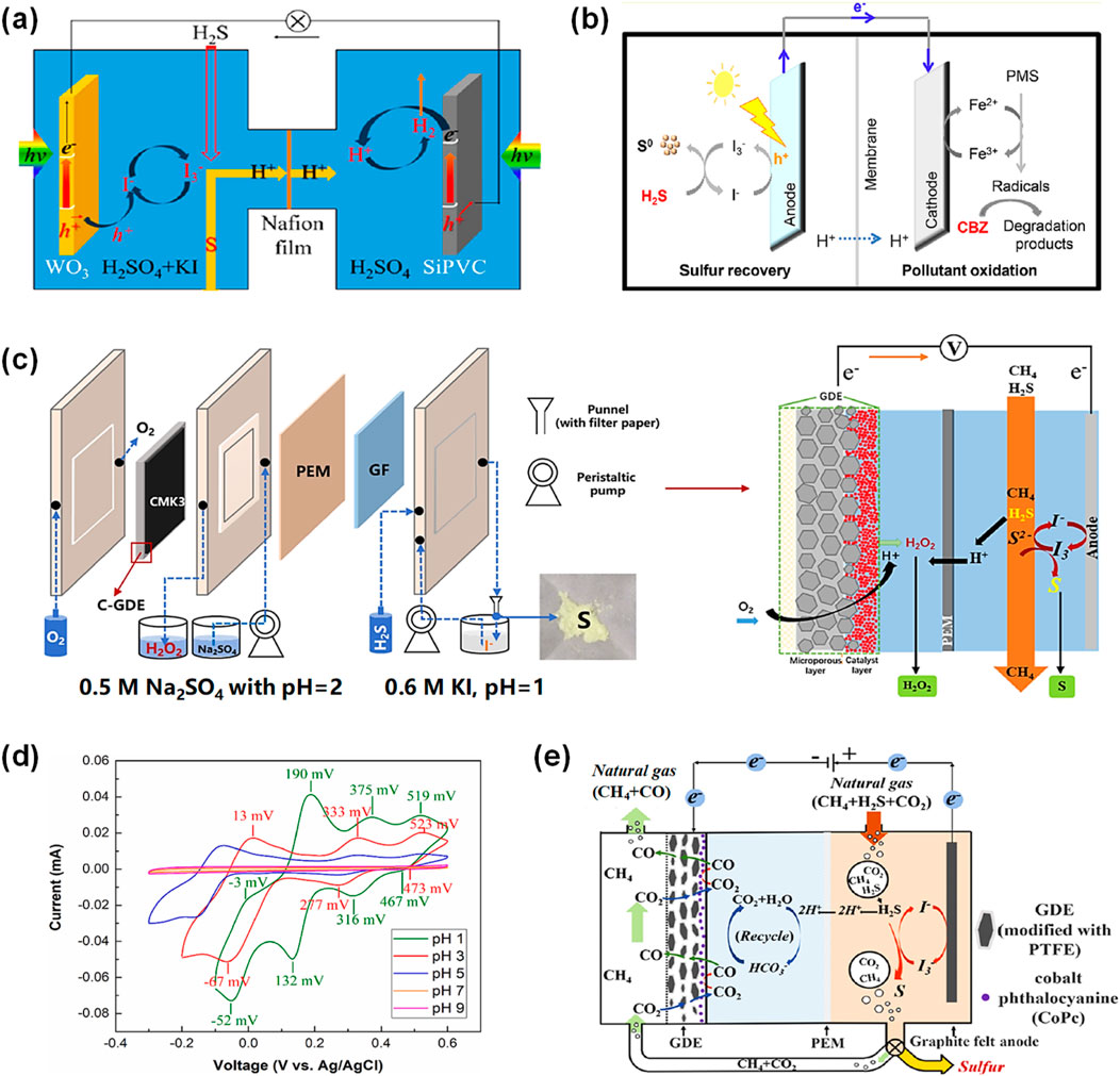 Figure 9. I−/I3− and polyoxometalates as redox mediators for indirect electrocatalytic decomposition of H2S. (a) Schematic diagram of a self-driven photoelectrochemical splitting system of H2S with I−/I3− as redox mediator (Luo et al., 2017). (b) Schematic diagram of simultaneous recovery of sulfur resources from H2S and degradation of organic pollutants by photoelectrocatalysis (Li et al., 2018). (c) The designed cell and operation mechanism for indirectly H2S conversion to synchronously yield H2O2 and sulfur (Cui et al., 2024). (d) CV curves of 1 mM (NH4)11 [Sm(PMo11O39)2] on a glassy carbon electrode at various pH values (Li J. et al., 2021). (e) Operation principle diagram for the electrocatalytic synergistic conversion of H2S and CO2 into sulfur and carbon monoxide system (Zhang B. et al., 2021).