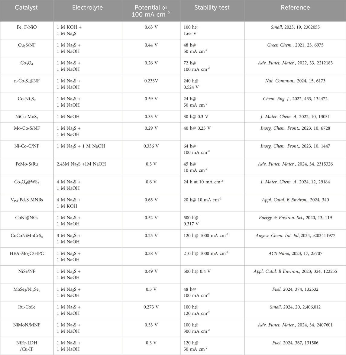 Designing SOR electrocatalysts with high catalytic activity, anti-passivation of sulfur (referring to the ability of the catalyst to prevent sulfur from adhering and causing catalyst deactivation), and long-term stability is an effective strategy to mitigate anodic sulfur passivation in electrocatalytic decomposition of H2S (Kim and Lee, 2023). Recently, researchers have developed SOR electrocatalysts mainly from the following aspects (Yu et al., 2024): (1) Constructing a sulfur-phobic interface by controlling the catalyst’s affinity for sulfur to prevent the product sulfur from adhering to the catalyst surface, facilitating the self-cleaning effect of the electrocatalyst. (2) Modulating the electronic structure of the SOR catalysts by surface modification, alloying, heterojunction construction, and core-shell architecture, could optimize the adsorption and desorption free energies of sulfur-containing intermediates, ensuring the optimum binding between the active catalyst and reaction intermediates, thus improving the catalytic activity while preventing anodic sulfur passivation.