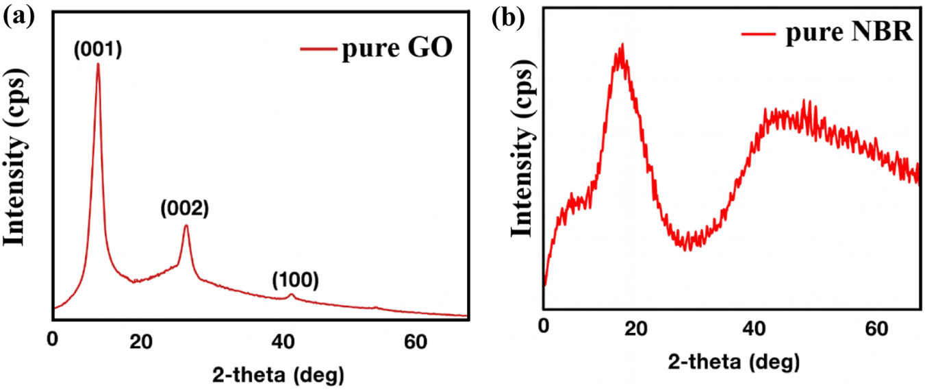 XRD analysis is essential to determine the structure of nanocomposite materials, as well as to calculate crystallite size. Pure GO (a) and NBR (b), which were used as the initial matrices, were analyzed by XRD analysis. The diffractogram is shown in Figure 5.