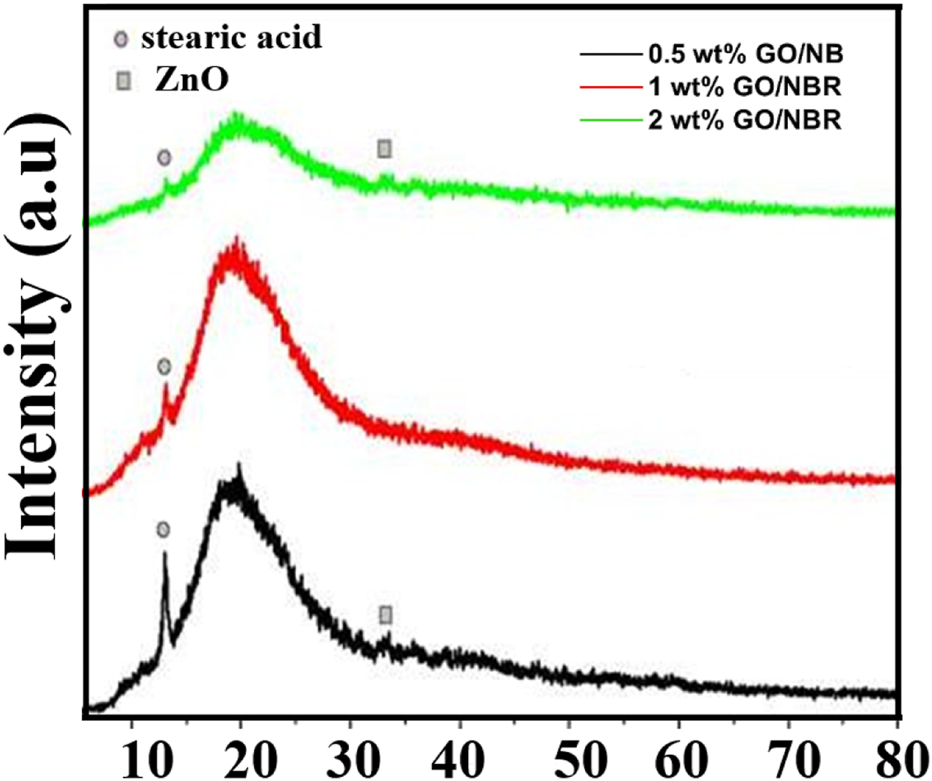 In the 0.5 phr GO/NBR composite, XRD reveals peaks at 2θ = 12.98° and 33.27°. In the scientific literature, 2θ ∼ 12°,16°, and 24° correspond to pure stearic acid diffraction peaks. In the 0.5 phr GO/NBR composite, XRD reveals a peak at 2θ ≈ 12.98°, which corresponds to stearic acid, utilized as an initial agent during the composite preparation stage (Chaichan et al., 2017; Habib et al., 2017). This stearic acid-related reflection is still visible for the 1 phr GO/NBR sample, although with lower intensity. However, this peak significantly decreased in the 2 phr GO/NBR composite. Because the amount of stearic acid is the same in all composites, the significant decrease in this peak at 2 phr GO is attributed to a change in its physical state. At higher GO loading (2 phr GO/NBR), stearic acid is strongly adsorbed on the GO surface, so the intensity of this peak decreased. Overall, the XRD patterns align well with those reported in the literature (Habib et al., 2017; Yong and Munusamy, 2023).