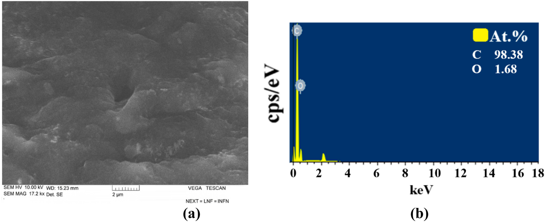 Based on the results of SEM, NBR is composed of both small and large microcracks. At the same time, from EDS analysis, it was found that it contains 98.38% C and 1.68% S elements.