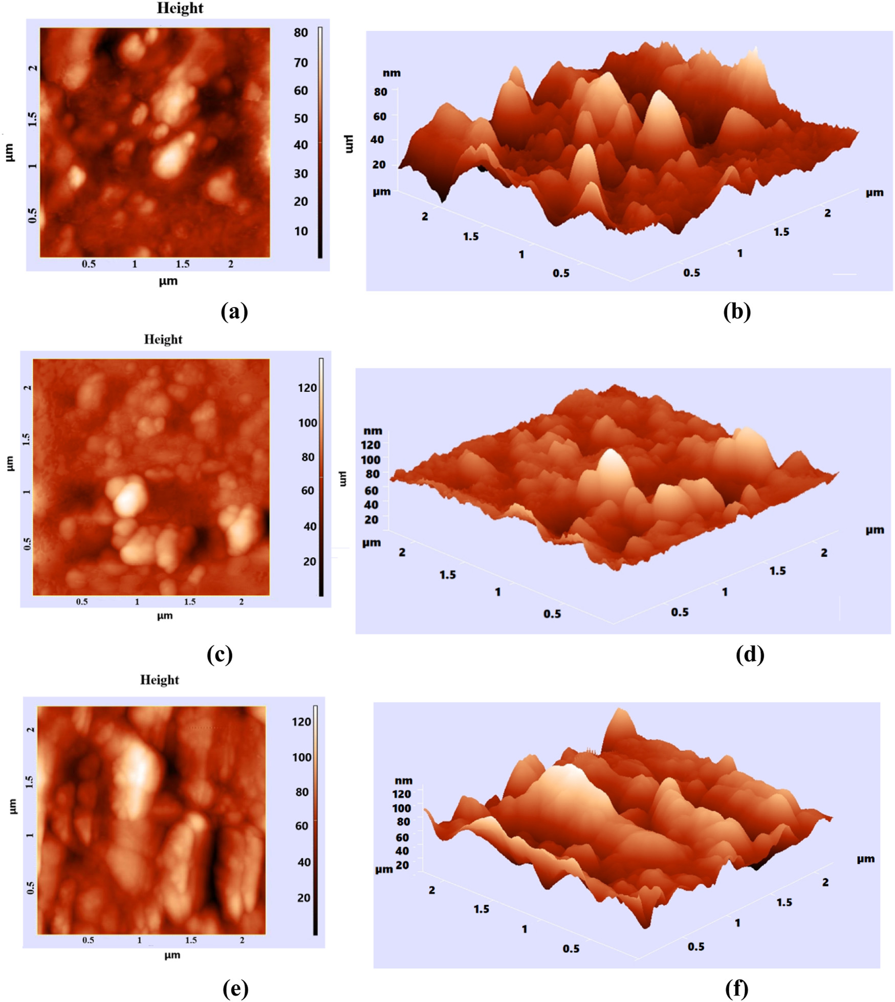 AFM is an essential technique for obtaining detailed information about the sample surface, including its topography, two-dimensional (2D) and three-dimensional (3D) images, and data on the arrangement density and histograms of nanostructures in the nanometer range. Figure 10 illustrates the 2D (Figures 10a,c,e) and 3D (Figures 10b,d,f) images of the composition and surface distribution of different phr GO (0.5 phr, 1 phr, and 2 phr) in NBR.
