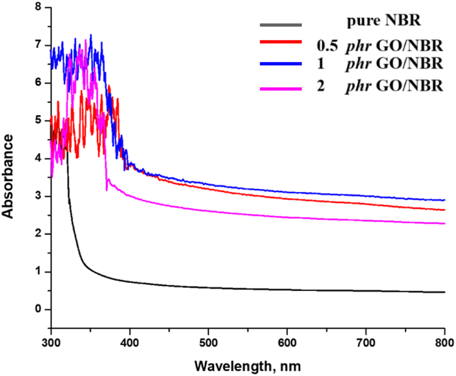 Figure 4 presents the spectra of neat NBR and NBR/GO nanocomposites containing 0.5 phr, 1.0 phr, and 2.0 phr GO.