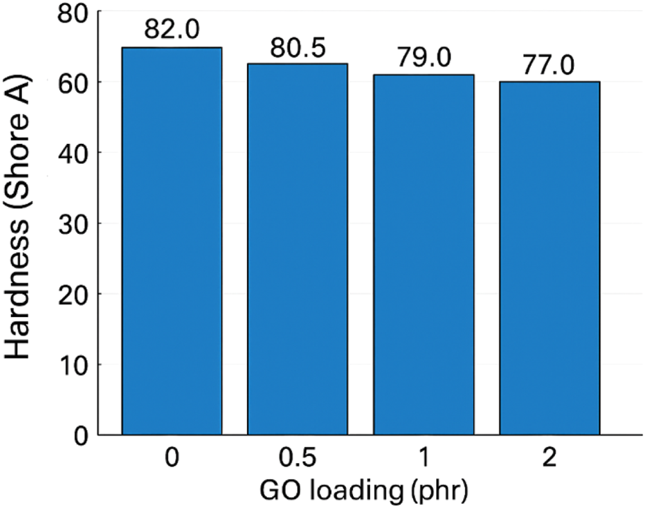 Overall, the FTIR data show that GO is successfully introduced into the NBR matrix without generating new covalent-bond signatures. The preserved position of the nitrile band, together with its modest broadening and the emergence of GO-related C=O and C–O bands, points to an interface dominated by physical interactions, primarily hydrogen bonding between NBR nitrile groups and GO hydroxyl/carboxyl functionalities, assisted by dipole–dipole interactions between polar groups, rather than extensive chemical grafting (Mammadov, 2024). These non-covalent interactions provide a reasonable microscopic basis for the improved dispersion and interfacial adhesion, and for the property enhancement observed particularly at 1.0 phr GO.