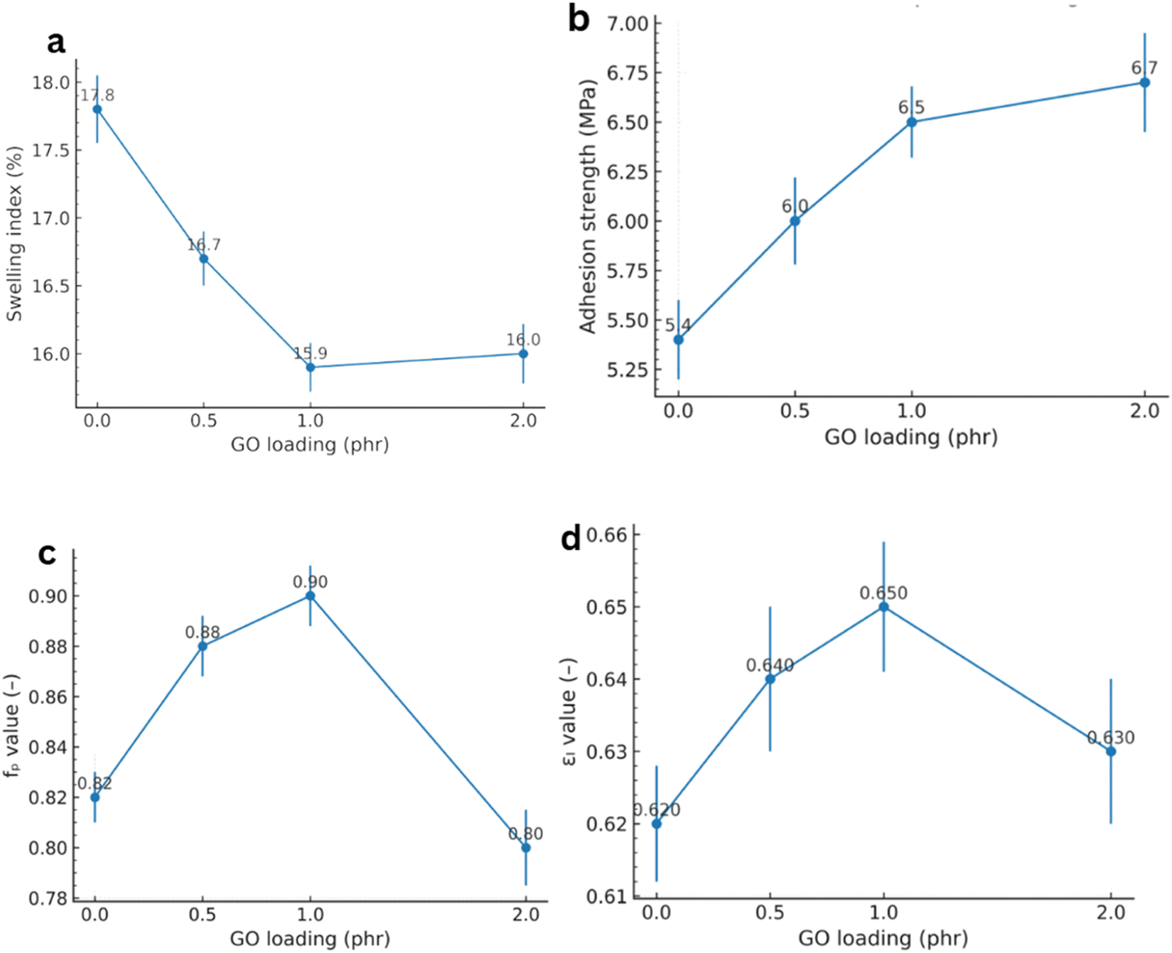 In NBR, these surface functionalities enable hydrogen bonding and strong dipolar coupling to nitrile groups, promoting dispersion, interfacial adhesion, and stress transfer at substantially lower loadings than conventional fillers (Harito et al., 2019). As a result, GO-filled NBR frequently exhibits simultaneous gains in tensile strength, storage modulus, wear resistance, and aging stability at ≤1–2 phr (Mensah et al., 2018a). Beyond mechanics, interfacial polarization and chain immobilization at GO surfaces can also tailor dielectric response and reduce solvent uptake by introducing tortuous diffusion paths and locally increased network density (Badia et al., 2021).
