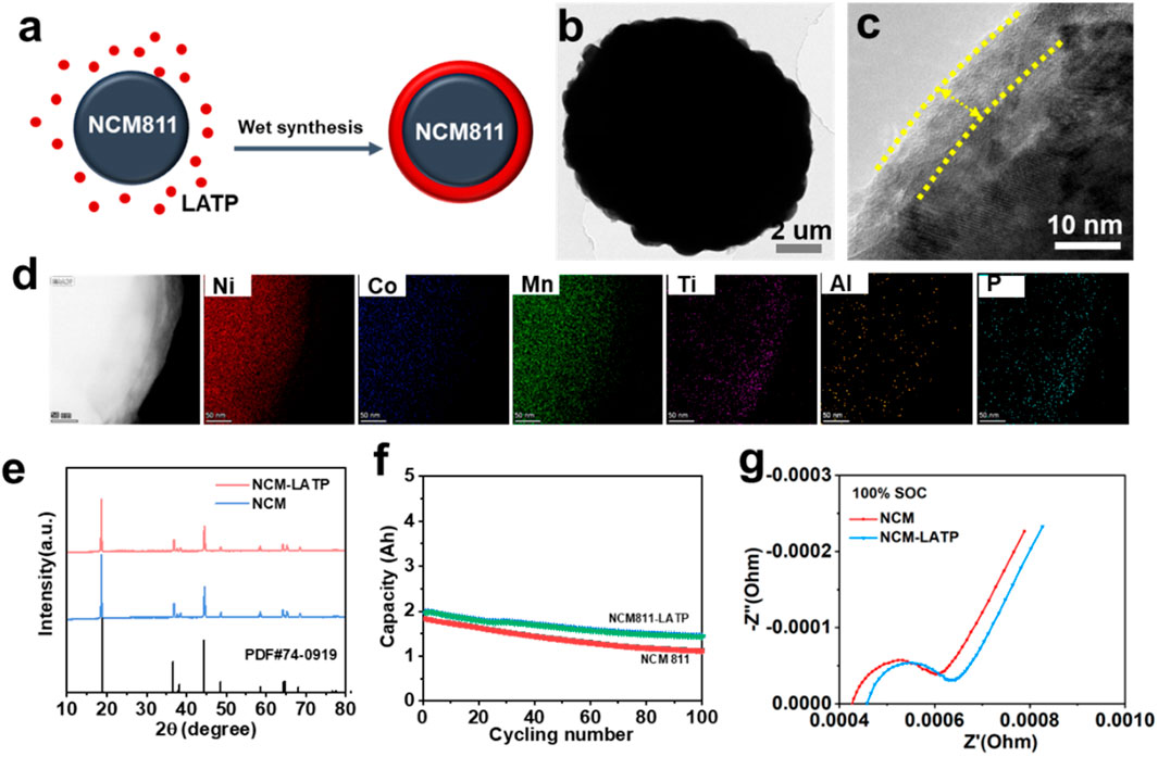 Figure 1. (a) Schematic illustration of the LATP surface modification strategy. (b) TEM image of pristine NCM-LATP. (c) High resolution TEM image of NCM811-LATP (d) EDS elemental mapping of NCM811-LATP. (e) XRD patterns of NCM-LATP and NCM. (f) Cycling performance at 0.5C and 25 °C. (g) Electrochemical impedance spectra at 100% state of charge.