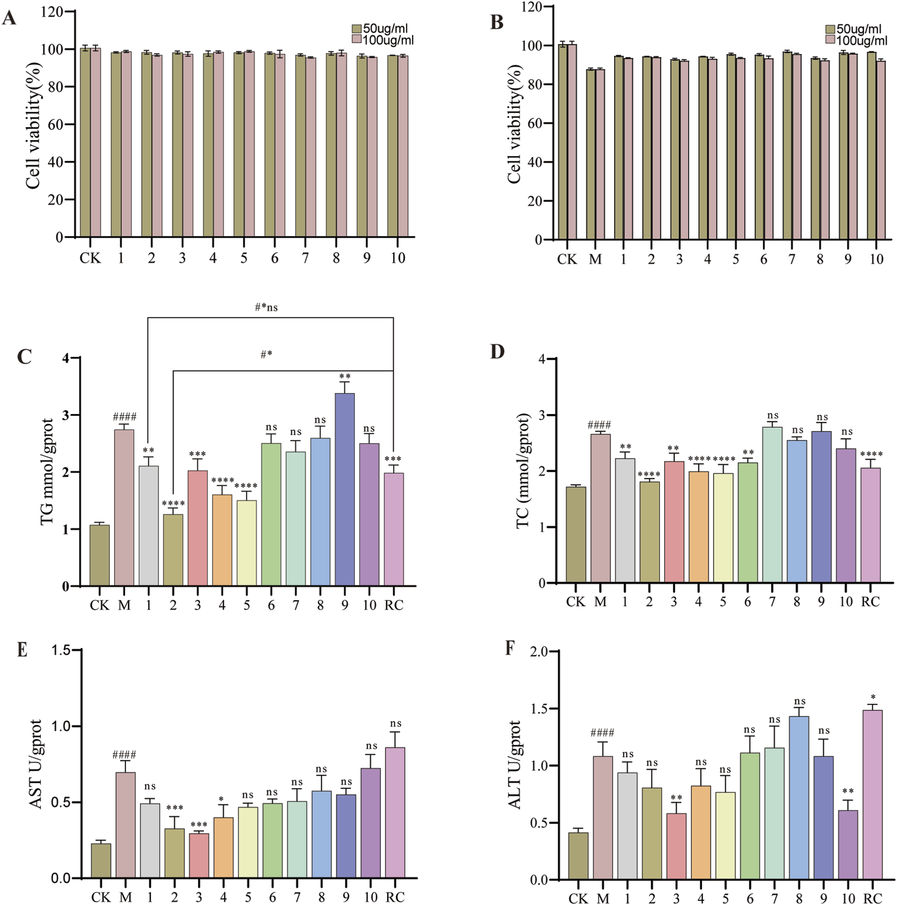 Thelipid-lowering activity of different compounds. (A) Effect of the compound on HepG2 cell viability. (B) Effects of the compound on HepG2 cell viability induced by OA. (C) TG levels. (D) TC levels. (E) ALT levels. (F) AST levels. Data are shown as mean ± SD (n = 3). (#) p < 0.05, (##) p < 0.01, (###) p < 0.001, (####) p < 0.0001 and versus non-induced cells (Control). (*) p < 0.05, (**) p < 0.01, (***) p < 0.001, (****) p < 0.0001 versus induced cells (Model). (#*) p < 0.001, #*ns: not-significant versus non-induced cells (RC). Subsequent biochemical indicator studies of pure compounds will uniformly use 100 μg/mL for research.