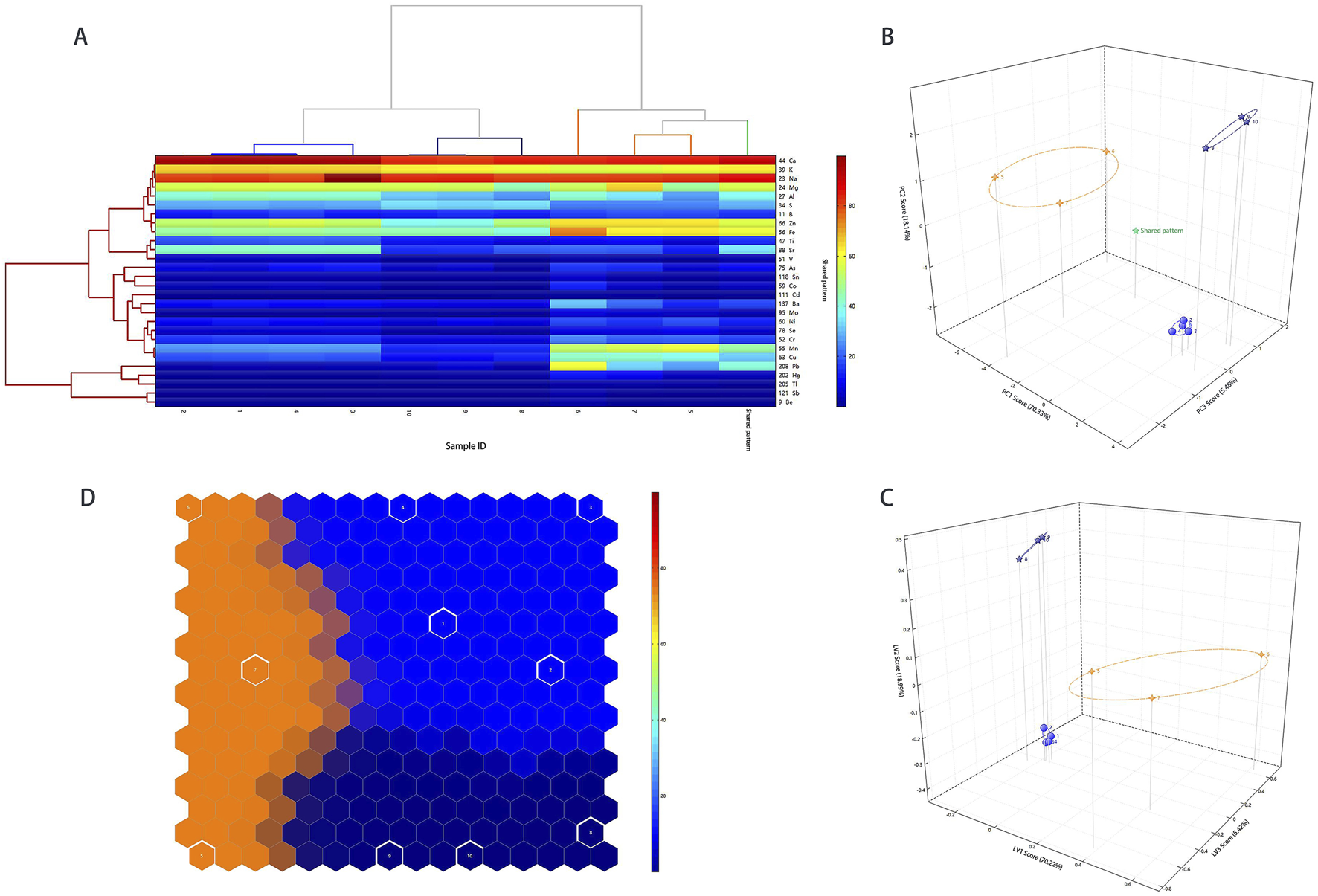 Dendrograms of the HCA (A); score plots of the PCA model (B); loading plots of the elements in PC1 (C); loading plots of the elements in PC2 (D); score plots of the PLS-DA model (E); self-organizing mapping artificial neural network analysis (F).