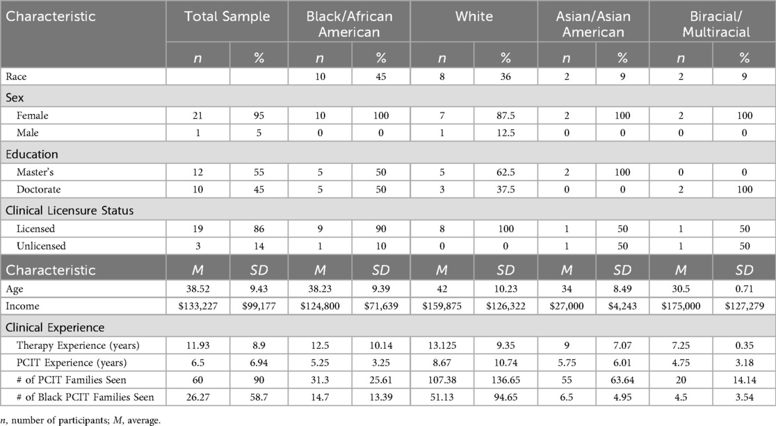 Participants were PCIT clinicians recruited via emailed flyer dissemination through the PCIT International listserv, with one additional clinician referred by another clinician. In order to be eligible to participate in the study, participants were required to: (1) be trained in PCIT or in the process of being trained, and (2) have provided PCIT to one or more Black families. In total, 22 clinicians were interviewed for the study with the sample ranging in age from 28–62 (Mage = 38.5, SD = 9.43) with ∼95% of participants being women (n = 21). Participants identified racially as 45% Black or African American (n = 10), 36% White (n = 8), 9% Asian or Asian American (n = 2), and 9% Multiracial or multiracial (n = 2). In the sample, 19 clinicians were fully licensed (86%), with approximately 45% (n = 10) holding a doctorate degree, while 55% (n = 12) had master's degrees. Among participants, annual income ranged from $24,000 to $400,000 (M = $133,227.3, SD = $99,177.06). Clinicians had been practicing therapy generally between 4 and 40 years (M = 11.93, SD = 8.9). Further, clinicians had a range of 1.5 and 35 years providing PCIT (M = 6.5, SD = 6.94) with estimates of treating between 4 and 350 families (M = 60, SD = 90), using PCIT. Specific to treatment with Black families, participants' estimates ranged from working with 2 Black families to 280 Black families (M = 26, SD = ∼58) (See Table 1 for a full summary of participant characteristics).