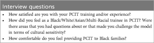 Clinicians were specifically interviewed regarding their experiences in working with Black families in PCIT treatment. The structured interview was designed by the research team in tandem with a consultant experienced in EBT programs' cultural adaptation. The final structured interview was theory-driven regarding previous PCIT cultural adaptations and treatment barriers for Black families, as well as based on the components of PCIT: assessment, Child Directed Interaction (CDI), and Parent Directed Interaction (PDI). The structured interview contained several sections with respect to clinician demographic information (as described above in the participants section), and with specific probing questions relevant to PCIT's helpfulness to Black families, attrition and perceived contributing factors, recommendations for improvements, clinicians' utilization of culture into treatment, and their general PCIT training experiences, as well as training specific to addressing issues of culture within treatment. For the current study, researchers analyzed the subset of questions related to clinicians' training experiences (see Table 2 for interview questions).