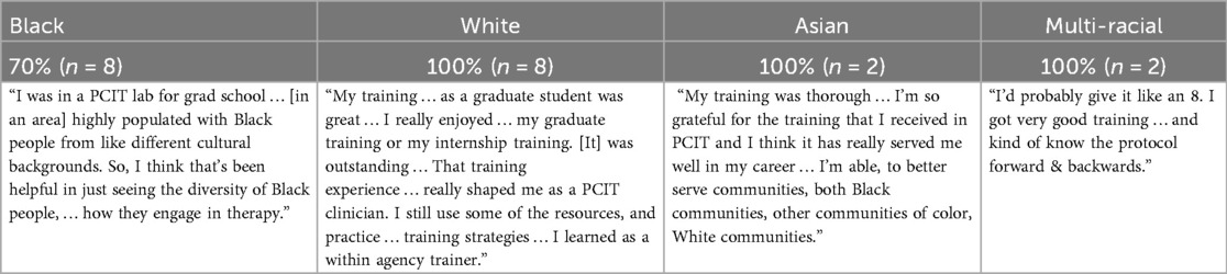 Clinicians across the board spoke laudably about their core PCIT training. When asked to rate their training experiences on a scale from 1–10, with higher scores representative of more favorable endorsements, most participants rated their core PCIT training experience as being an 8 or better. Among White, Asian, and Multi-racial clinicians, 100% rated their core training experiences as being an 8 or better, with 70% of Black clinicians saying the same. The commentary in Table 3 illuminates several aspects of clinicians' positive core PCIT training experiences. They included: (1) the location of training in which clinicians often mentioned graduate programs, internships, and postdoctoral programs, (2) access to diverse populations to train with, and (3) strong knowledge of the manualized treatment protocol.